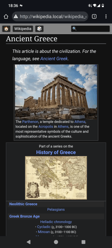 You should now be able to connect to the wikipedia.local hotspot and open http://wikipedia.local (not https!) in any device that has a browser (for example smartphone).